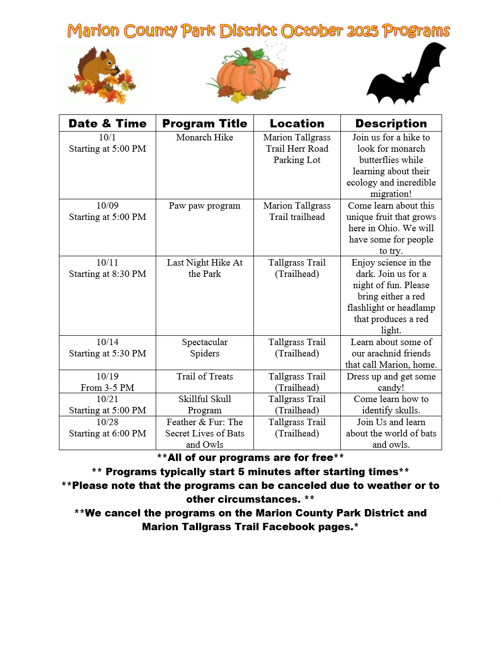 - ** We cancel the programs on the Marion County Park District and Marion Tallgrass Trail Facebook pages.
