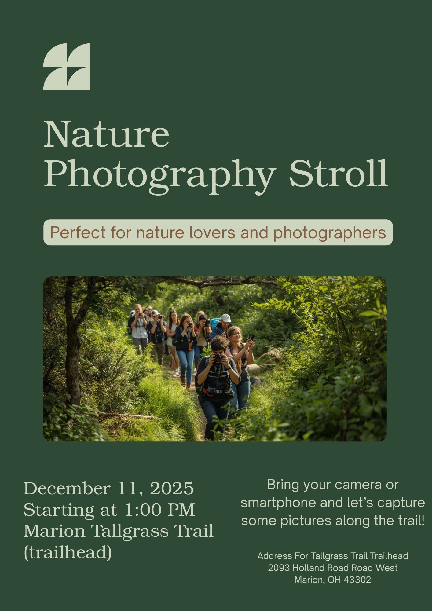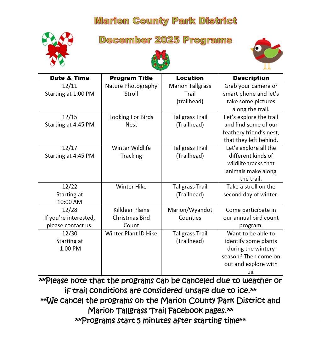 - ** We cancel the programs on the Marion County Park District and Marion Tallgrass Trail Facebook pages.